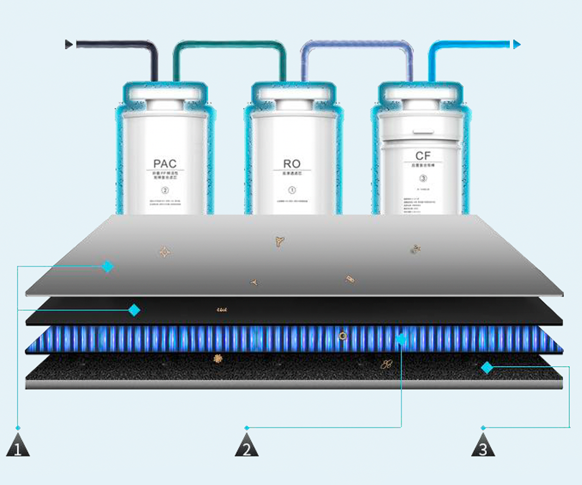 宇宙技術RO浄水:4層フィルターで塩素、細菌、重金属、不純物を99%以上除去し、0.0001ミクロンまで浄化します。